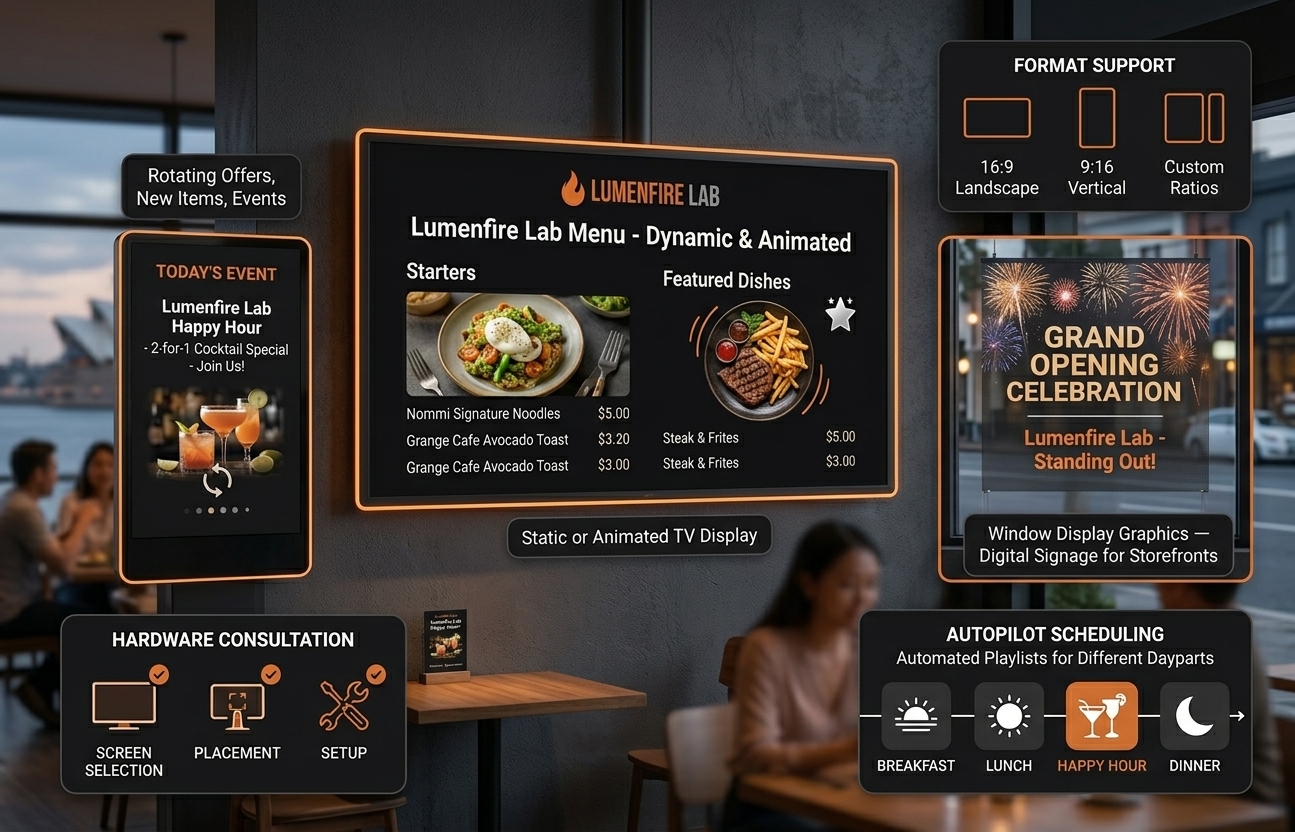 - Window display graphics — digital signage for storefronts